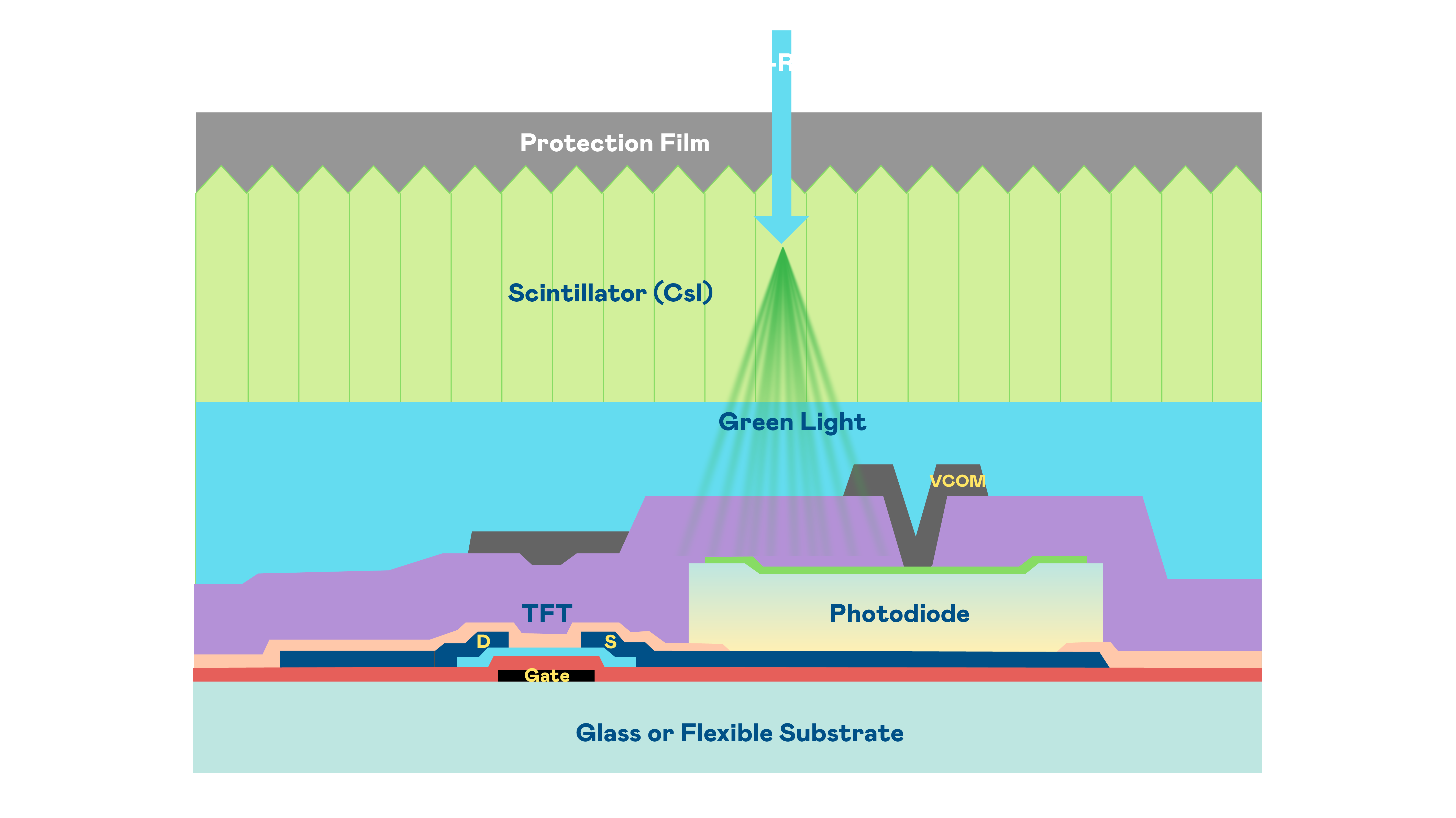 ag尊龙的X光影像感测阵列使用薄膜电晶体 (TFT) 作为每个像素的读取开关,搭配光电二极体(Photodiode)的光电转换元件,用以感测X光影像讯号。